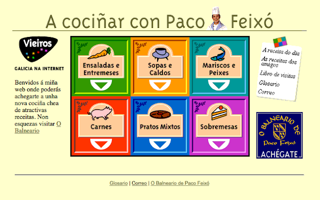 Atopei no vello Vieiros este Glosario de Cociña de Paco Feixó, no seu tempo o cociñeiro galego máis mediático e que hoxe, ademais de ter restaurante en Vigo, é xerente de Lugar da Santiña en Portas (Pontevedra), unha empresa que produce quinta gama e que, como se pode ver na captura da web, ofrece o seu espazo profesional na rede tamén en galego.